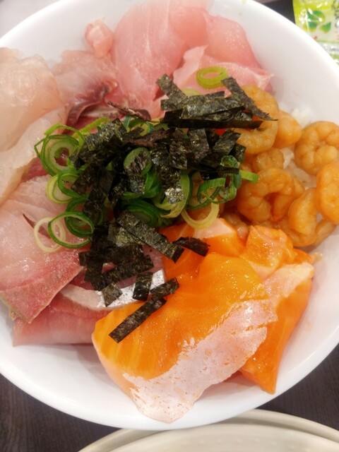 ご飯をふんわり平たく盛った1番大きい丼に、これでもか!というくらいお魚盛りまくった。