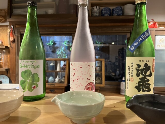 お酒のお代わりをお願いすると、またまた変わり種の3種飲み比べ。三井の寿のモダンな春酒に、麗という苺ジュースみたいな甘酸っぱいお酒。最後はどっしりクラシックな池亀の無濾過生原酒。あはは、楽しいなぁ。