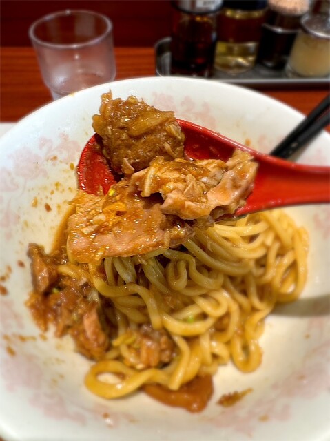 それではと中のタレ?を麺に絡めるべく箸とレンゲを使って天地返し〜!結構固形タイプでなかなか手強い?割れた卵黄を利用してさらにまぜまぜ、馴染んだらがふり、すばばばーっとすするとコクがあって甘辛い味付け、ニンニクの風味、カリカリとしたニンニクチップが小気味よくいいアクセント。タレの中には刻みチャーシュー(形はランダムスライス系からごろっとしたものまで入っててうまっ!)、柔らかく煮てあるメンマ。