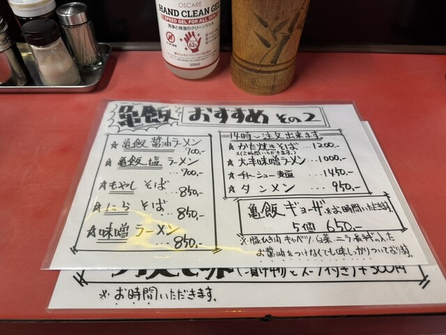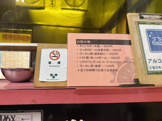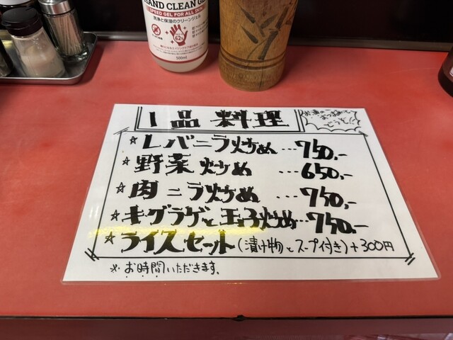 そして、店内に入って分かったのはカウンター席は5席、4人掛けのテープ席が2卓。調理はほぼ店主さんが担当、お手伝いをされていた年配の女性はご店主さんのお母様で聞こえてきたお話からするに最近ケガをしてしばらくお休みしていたそうです。その影響もあってお店の回転が遅くなってしまっているようです。