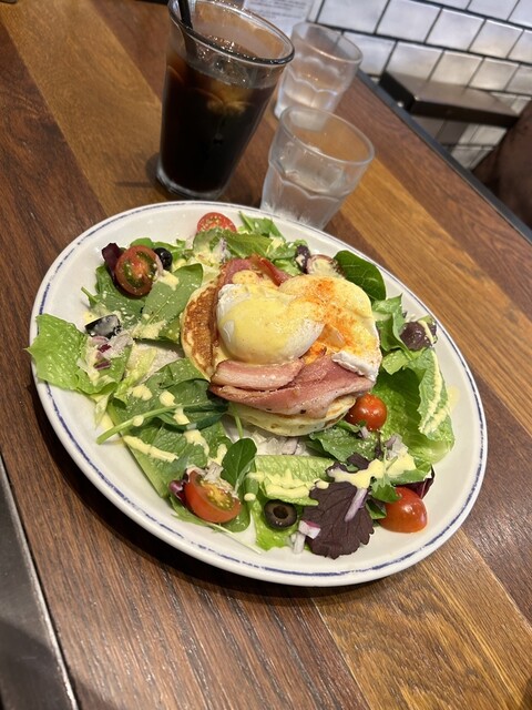連れはしょっぱい系「エッグベネディクトパンケーキ」&アイスコーヒー