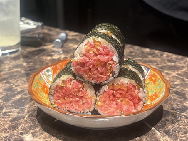 そして最後の〆に選んだのは新宿店限定の「生肉キンパ」!!!ご飯よりも圧倒的に生肉の量が多い贅沢なキンパです。やはり新宿店限定ということもあり、周りのテーブルの方もこの生肉キンパ頼まれてる方が多かったです。