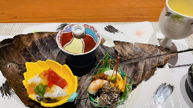 【食前酒】梅酒【前菜】牡蛎マリネ、紅葉豆腐、鮟鱇酒蒸し、長芋京味噌焼き
