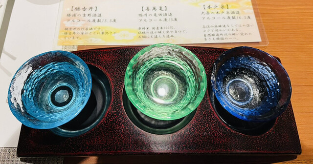 【地酒飲み比べセット】¥1.100・腰吉井(吉野酒造 千葉県勝浦市)・寿萬亀(亀田酒造 千葉県鴨川市)・木戸泉(木戸泉酒造 千葉県いすみ市)