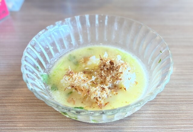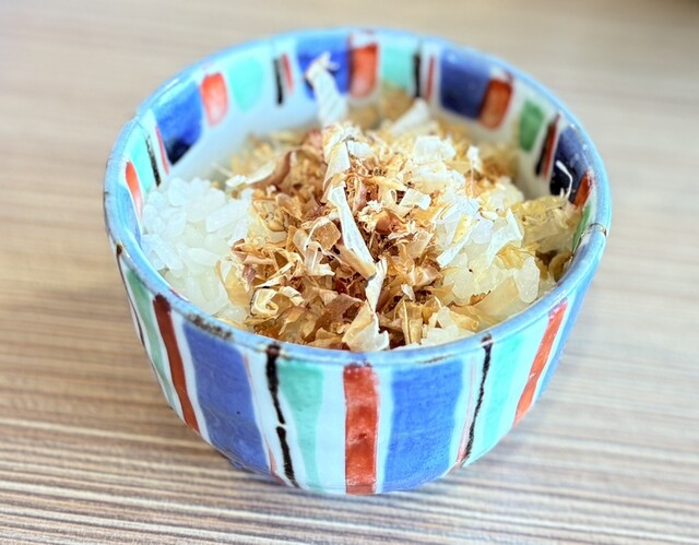 食べ終えたお汁の中に、ミニサイズの冷たい鰹節ごはんを投入!