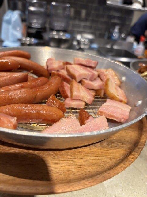 野菜のマリネがおいしいことに心を奪われていたら、なんとベーコンの美味しいことを再発見。これは、一緒に盛ってある、ソーセージも期待できると思います。