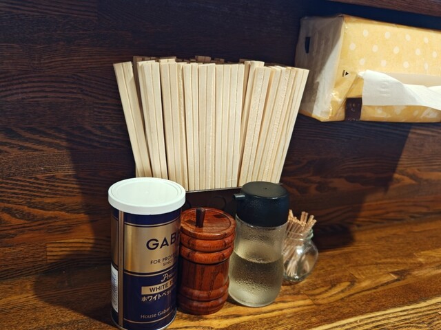 カウンターの奥行きを確保する、幅の広い箸入れ。割り箸が広がってとても取りやすいです