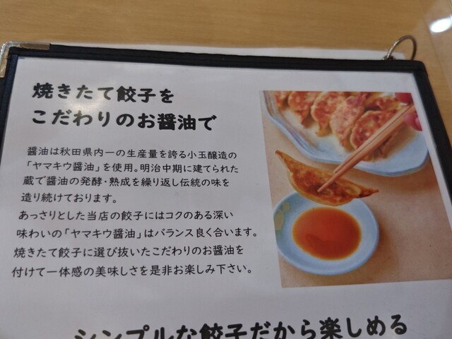 合わせるタレですが、ご店主一押し「醤油+和辛子」が、秋田「ヤマキウ醤油」の素晴らしさでダントツ。最近の好み「胡椒+酢」が全く霞んでしまいます。餃子3種すべて良いですが、基本の「横堀餃子」が、この醤油に一番合いますね。