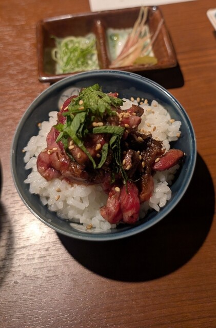 ハツ刺し、パリピ、韓国のりとクリームチーズ、ポテトサラダ、神居牛380gとイチボ350gを注文してのこったお肉をひつまぶしにしていただきました。
