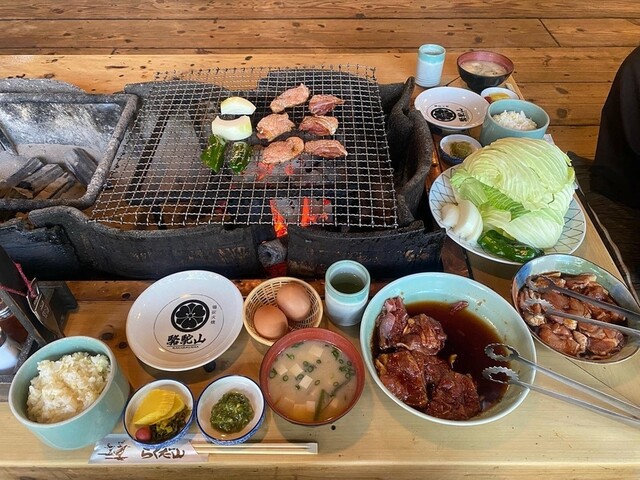ご飯は麦ご飯、山菜味噌汁、沢庵、卵、地鶏以外も拘り...