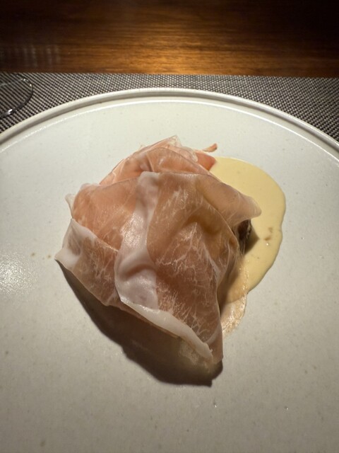 薄くて美味しすぎるスイス産の生ハムがたっぷり 中には林檎のフリット?ポルチーニ茸、チーズが絶妙 また食べたい