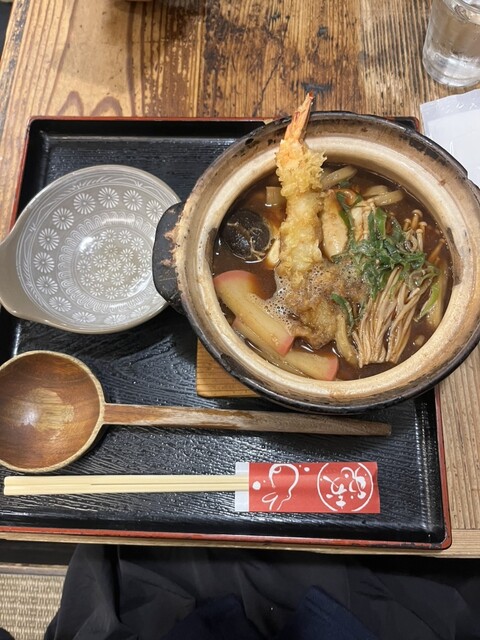 味噌煮込みうどんを注文しました。名古屋のものほど麺は硬くないですが、このくらいも食べやすくて好きです。海老天が入っているのですが、衣がとろとろになっていて美味しかったです。ここはどのうどんを頼んでも美味しいです。