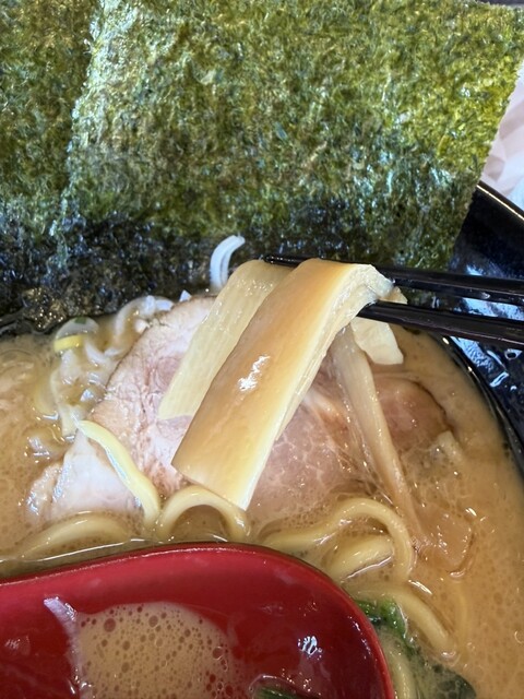 やってきたのはほうれん草に海苔三枚とチャーシューという家系基本セットに加えてウズラのタマゴがイン。いわゆる壱系の系譜でしょうかね。さらに家系には珍しいメンマも加わりデフォで賑やかな構成。さっそくスープから頂いてみると、程よいコッテリ感にクリーミーな舌触り。ポタージュ寄りで喉越しまで味が伝わるまろやかさでウマい!なんとも飲みやすい豚骨醤油スープ。