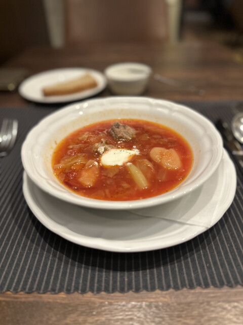 ボルシチは見た目もきれいで、牛肉と野菜の旨みがしっかり溶け込んだ味わい。ビーツの風味が強すぎず、日本人にも食べやすいスープでした。
