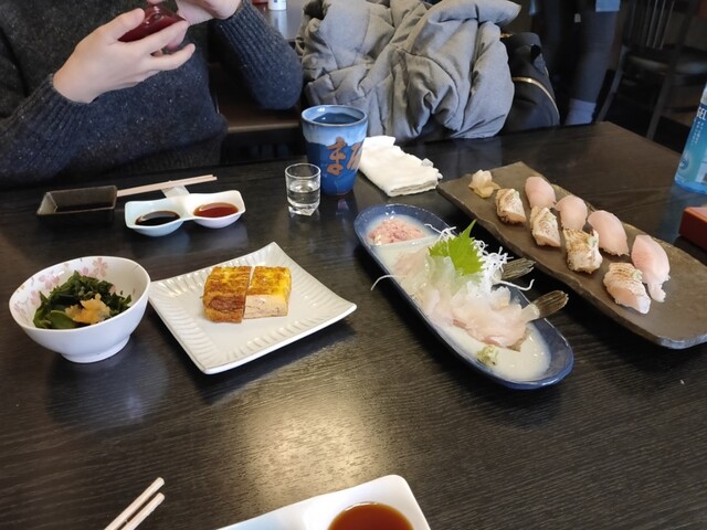 店主のおすすめに従い、刺身の盛り合わせ、てっさ、ふぐの唐揚げ、ふぐ白子タレ焼き、紅ズワイガニ、鰻とサバの寿司を楽しんだ。魚介の質、調理の技術ともに一流で、コストパフォーマンスにも優れた店。ユニークな店...
