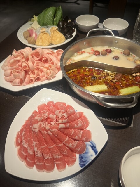 急に火鍋が食べたくなり予約なしで伺いましたが平日の夜だったからかすぐ入店できました。店内の奥の方は広くスペースがありはじめは貸切状態でしたが後から何組かみえていました。鍋は出汁や薬膳の旨みが出ていて2種類楽しめて良かったです。お肉はボリュームがありラムも臭みがなく美味しく頂きました。また行きたいと思います。