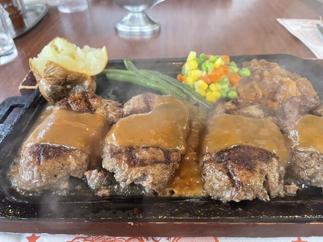 ダブルハンバーグステーキ(R)を頂きましたが、自分史上Top 3に入るくらい美味しいハンバーグでした!炭火で外はカリッと、中はレアの状態で提供されて、店員さんが鉄板で仕上げの焼きを入れてくれるスタイル。下味のしっかりついた粗挽き肉のハンバーグステーキで、アメリカで食べるような本格派のハンバーグステーキです。