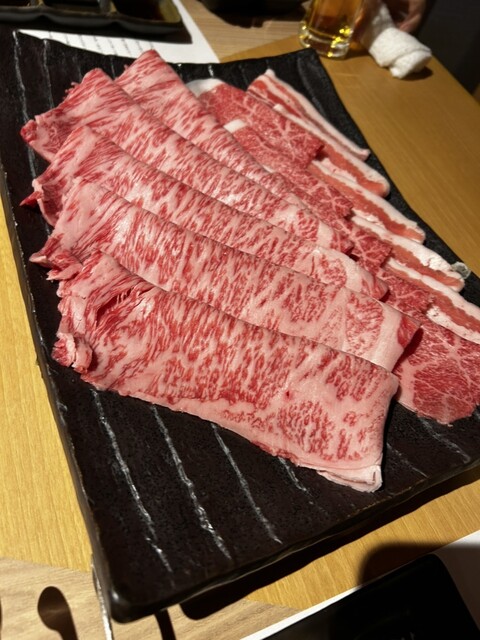 運ばれてきたお肉は、まさに「芸術品」と呼ぶにふさわしい美しさ。きめ細やかなサシが均一に入った断面は、焼く前からその質の高さが直感的に伝わり、期待に胸が膨らみます。