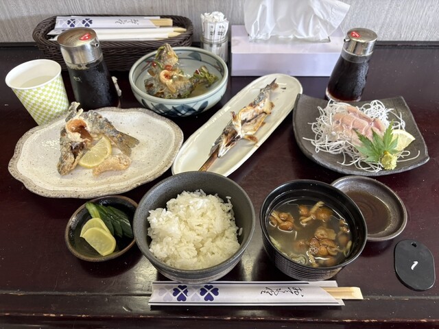 沙流川<セット内容>刺身、塩焼き、唐揚げ、南蛮漬け(4品)、なめこの味噌汁、ライス、漬物 2500円