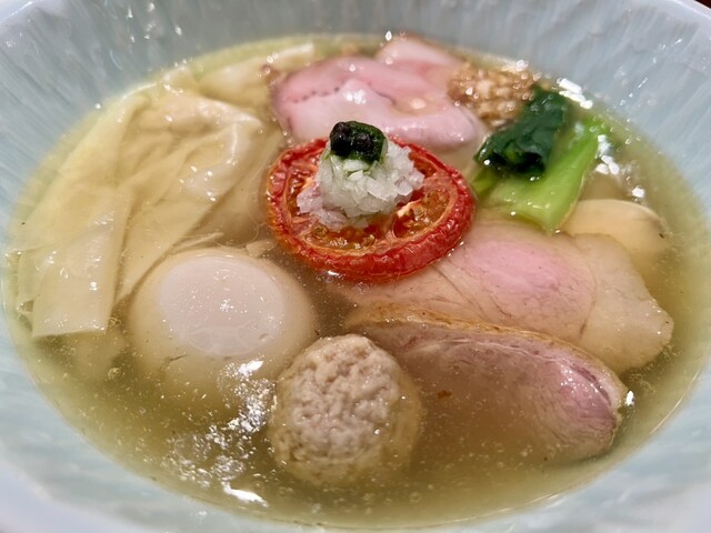 印象的だったのが、トッピングのトマト。玉ねぎとバジル、胡椒の実が添えられていて、出汁の効いたスープにトマトの旨み(グルタミン酸)が重なり、爽やかさがぐっと引き立ちます。