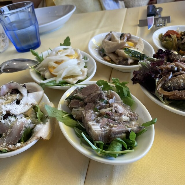 以前はコースがあったような気がするのですが、アラカルトになっていたの前菜6種、パスタ2品、ピザ一品を3人でシェア。