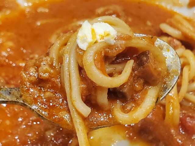 全体的には、「トマトガーリック+ピリッと感!」のやや大味な印象。そこに肉のうま味やチーズのまろやかさが加わった感じ!