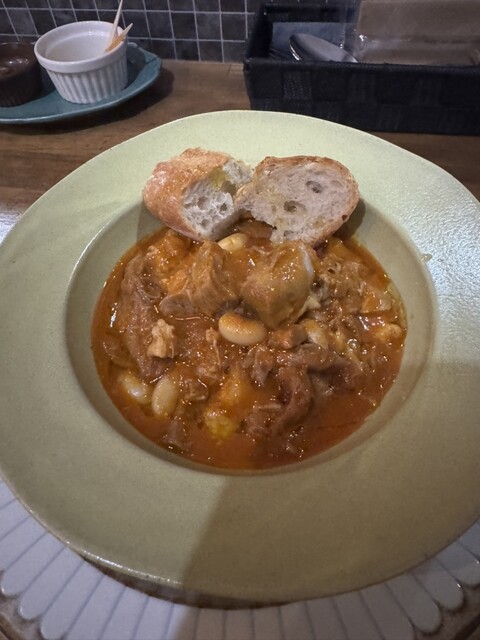 ガスパチョ:本来きゅうりが食べれないのですが、前回味見で少しいただいた時は大丈夫だったので今回も少し頂きました。食べてみるときゅうりが入っていることはわかるのですが青臭さはなく清涼感だけ感じられました。店主さん曰く、ガスパチョは日本だとトマトスープのイメージが強いけど、現地ではトマトは1/4くらいしか入っていないそうです(トマト、パプリカ、玉ねぎ、きゅうりが1/4ずつ)。なのでトマトだけのスープではないとのことで納得です。