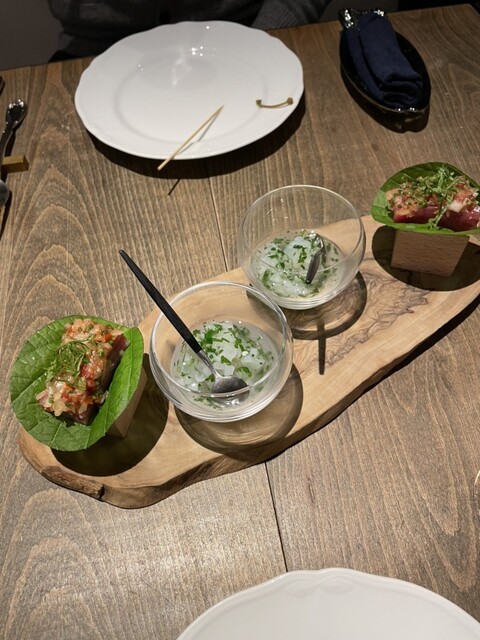 メニューはコースのみで、ドリンクはワインのペアリングかボトルを選択でき、今回はペアリングを。(ビールも3種類ほどありました。)