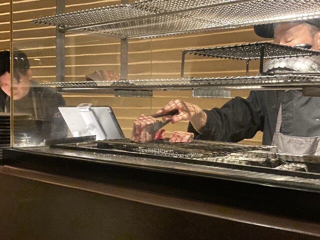 プレミアムランチ(税込み6600円)を予約しました。カウンターの前で、炭火でステーキを焼いていて、ライブ感があり、期待が高まります。