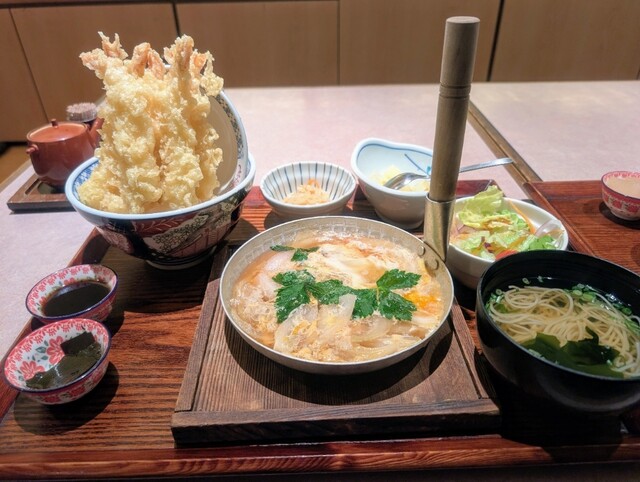 これでもかばかりにプリプリのエビ天が乗った海老盛り天丼。半分そのままで食べてから卵とじをかけて食べました。