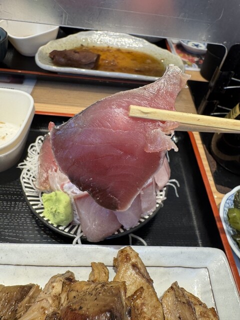 分かっていたもののいざ運ばれてくると、びっくりするわネギトロの量に!わさび醤油を垂らして一口目だけ豪快に頂いたけど美味〜ネギトロ好きは堪らんかも!!尾の身のステーキは分厚く食べ応え抜群!脂の乗った新鮮なお刺身も美味しかった!