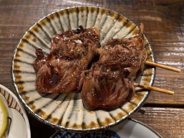 次々と炭火で焼かれた串が到着。どれもほんとうに美味しくて感心至極。肝は表面軽炙りのみでトロッとほぼ生の食感、サイコー。こころもレアな焼き具合で旨みと薫りが堪らない、皮タレはメッチャ好きな皮焼きでカリカリ過ぎず弾力がしっかりと残ってて延々と食べ続けられるヤツ、後ほどもう2本とずり塩も頼んじゃいました。