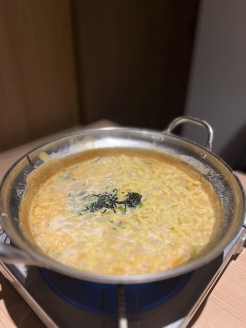 海老のミソがしみたお鍋に〆のラーメンは最高で濃厚スープが堪らないぜひ、〆はセットで頼んで欲しいです!