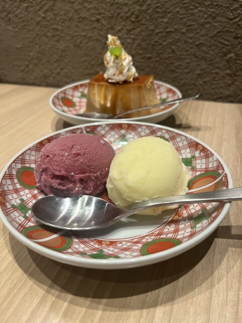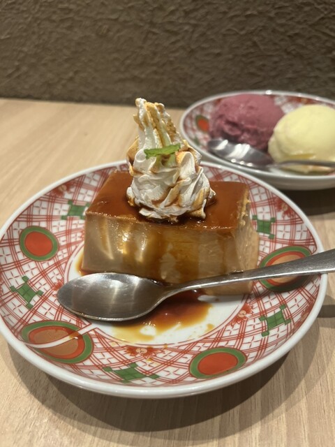 食後のデザートのプリンはチーズが入っていて、濃厚で美味しい✨食後はプリンを忘れないように食べて欲しいです!