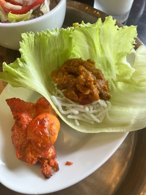 プジャランチのチーズナンセットを食べたのですが、カレー、ナン以外に、レタス包み、タンドリーチキンスープ、サラダ、ラッシーとボリューム満点✨