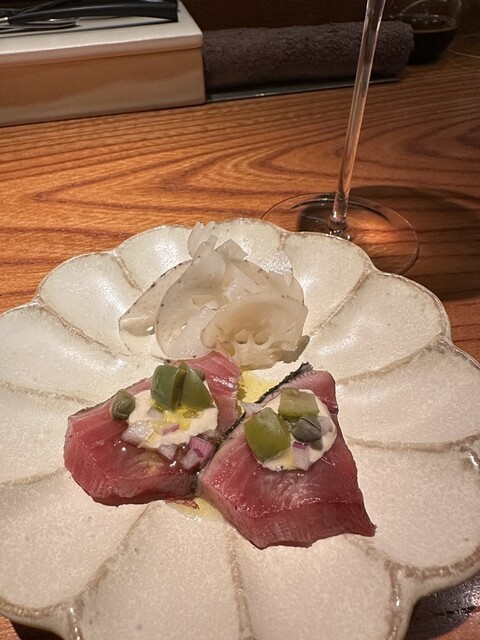 ◯鹿児島のヤイトカツオ ソースはカツオをコンフィにして卵黄とオリーブオイル 酢漬けのレンコン