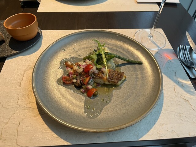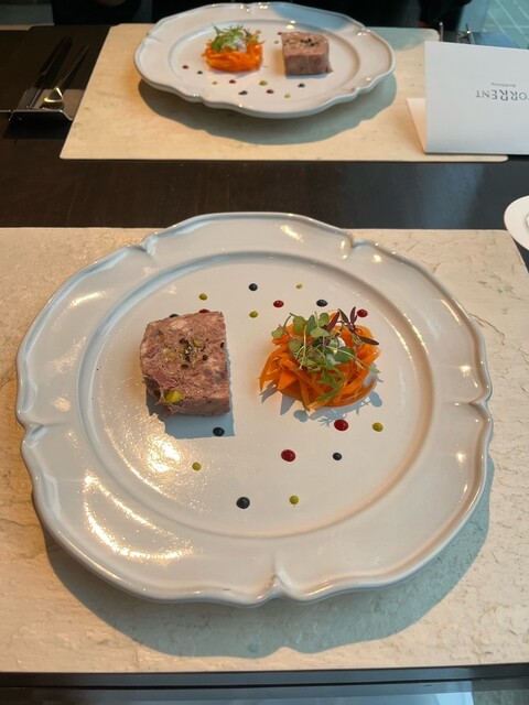 3種類の小さな可愛いソースをつけて頂きました。赤がフランボワーズ、黒がイカ墨だったかな?