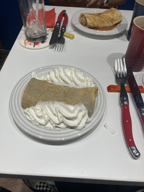 生地をナイフとフォークで食べるフランス流スタイル。クレープで生地をナイフで切って頂きます。風味もあって、クレープ生地モチモチで美味しいのです。