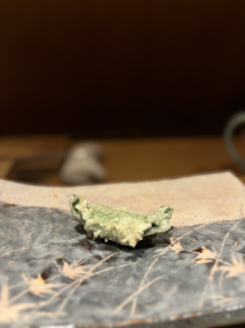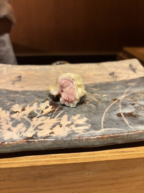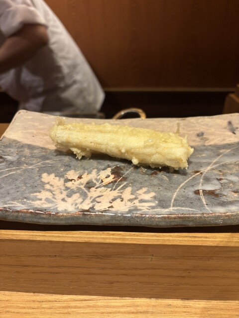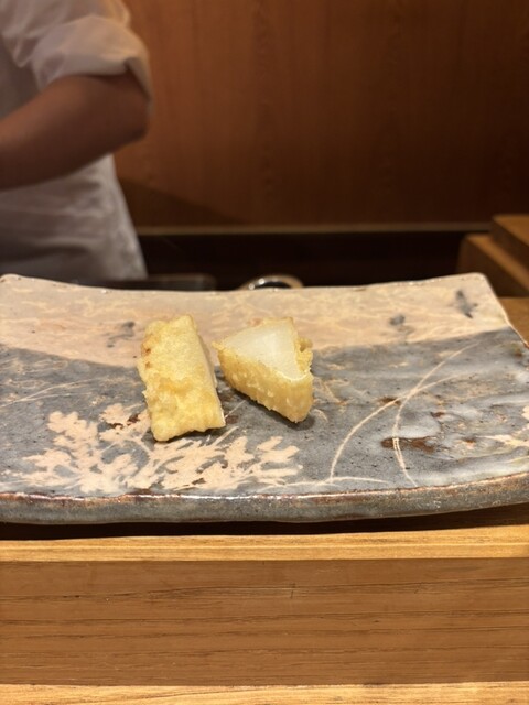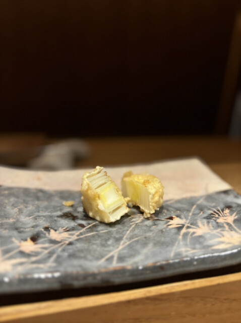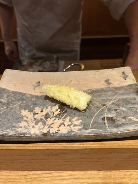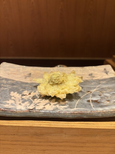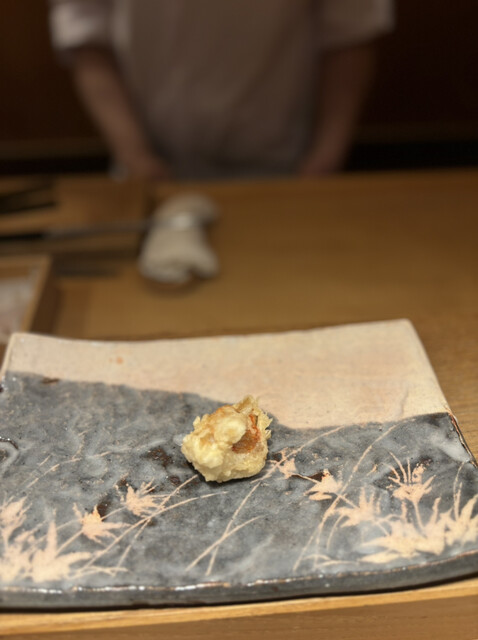 食材は、中トロ、車海老、頭に味噌入りの車海老、キス、天王寺蕪、フグの白子、月光ゆりね、アオリイカ、ふきのとう、白甘鯛、石焼き芋、津居山かに、天然ホタテ、カワハギの肝巻き、紫蘇巻きウニ、穴子の16品の天ぷら✨
