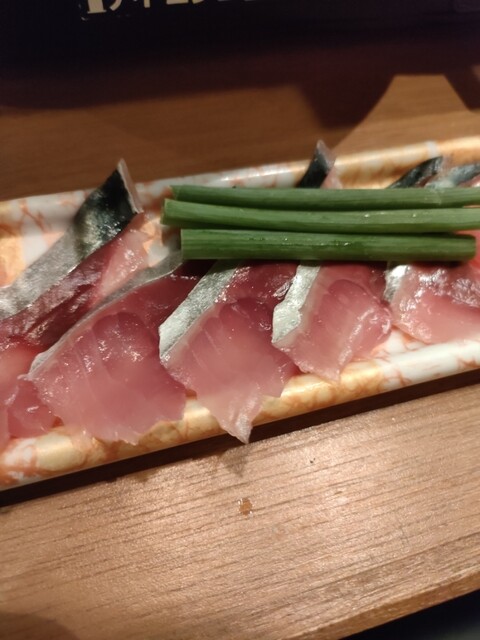 始めて食べる鯖(さば)の刺身のしゃぶしゃぶ。玉ねぎと一緒に煮た出汁でしゃぶしゃぶをします。元は漁師の賄い料理とのこと。