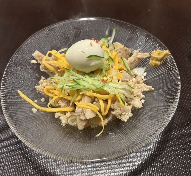 最初の写真にある大きなウズラの卵をのせた冷製パスタに見立てた中華麺にはキャビアがトッピングされていて美味でしたよ。