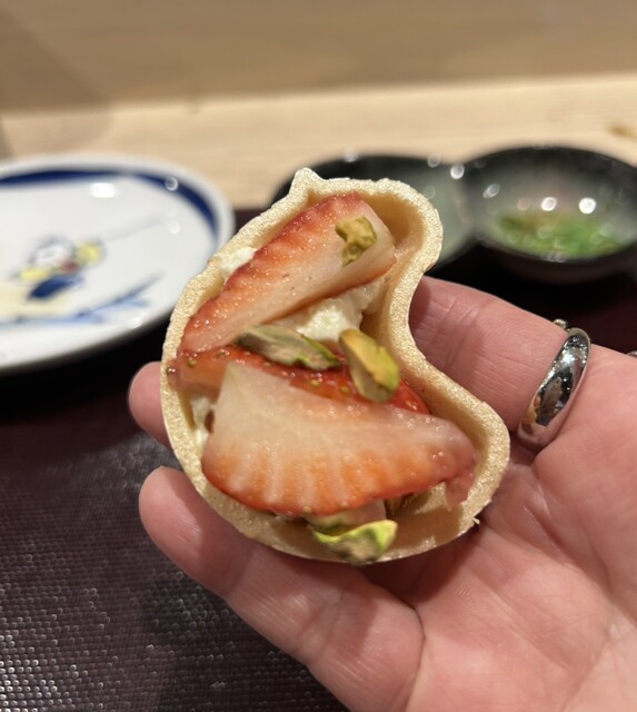 今回の鳥最中の中はいちごとクリームチーズ、ピスタチオ?だったかな。