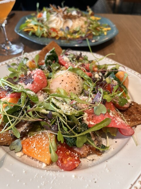 (温玉、鴨パストラミ、赤カブマリネ、柿、ケール、ミニトマト、オニオンドレッシング、マイクロリーフ、粉チーズ、ブラックペッパー)