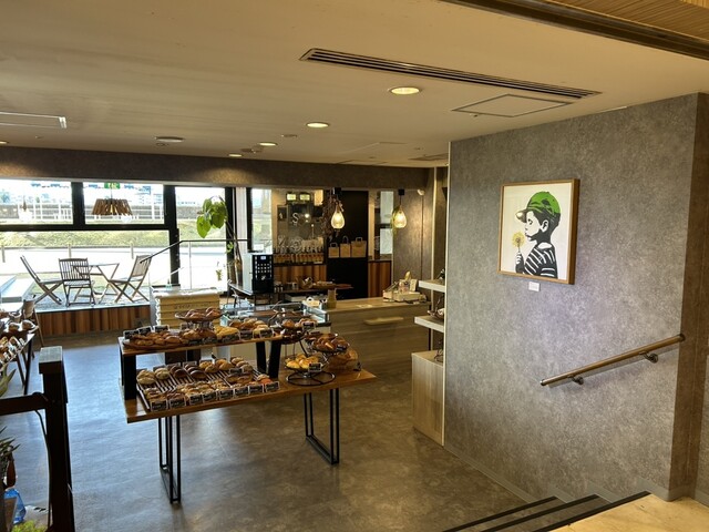 買ったパンは店内、店前のテラス、道を挟んだ川沿いの無料屋根付きテラスでも食べられます。