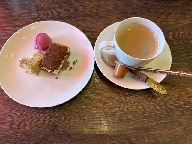 プレートランチセットのドルチェ盛り合わせはソルベ、シフォンケーキ、ティラミスの3種類。大満足でした。
