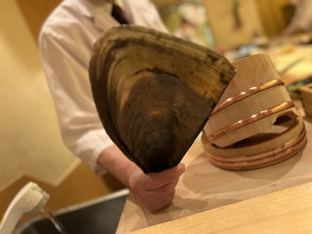 シャンパンやワインもあり、4人で1本ずつ開けました。お刺身 白身→赤貝→アワビ→名物のコハダの昆布巻き→鯵 梅醤→平貝→中トロ