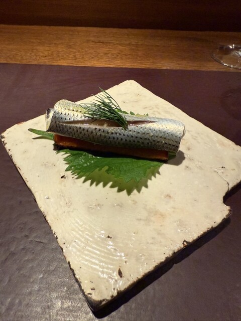 そして序盤にでてきたがスペシャリテの小肌のボカディージョ、こちらは大葉の上にパンコントマテ、小肌、ソース、ディルが乗ったものだが完璧なバランス。