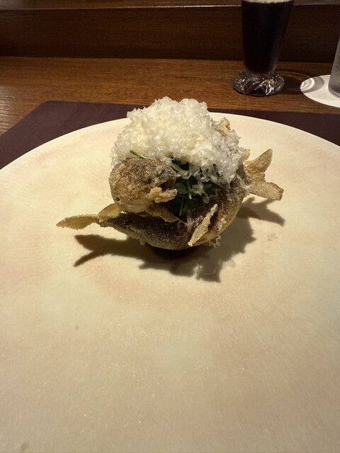 特に鮎のフリットは咀嚼した時に食材と食材の間の空気まで美味しい設計、いささか表現が難しいので適切な言葉を教えてほしいがこれほどまでに感動したのは久しぶり。フワフワに削ったマンチゴチーズに甘酸っぱいソースに香草、いつかまた食べたい。