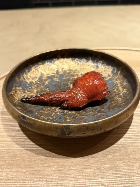 スペシャリテ、お皿の柄がパンチ強いのにそれにも負けない手羽先の照りと質感が期待を高める