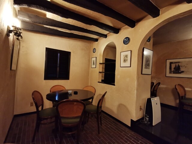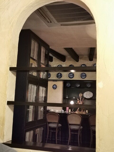 この日の「トロワシャンブル」さんは、水戸方面外食行脚3件目で、トリを飾るに相応しい素敵なカフェです。よって夫婦二人で小躍りしながら入店しました(笑)。テーブル席に着席し、先ずは店内の異国情緒を全身に浴びる!。はぁ~幸せだぁ~(悦)。暖色系の照明により、アイボリー色に染まった漆喰の壁にアーチ。天井に張り巡らされたダークオークな梁。重厚感たっぷりな調度品。モノクロームなアートの数々。微かに漂う煙草の匂い。その全てがアダルティックで蠱惑的です!(虜)。ただし煙草NGの方はご注意下さいね。(^_-)